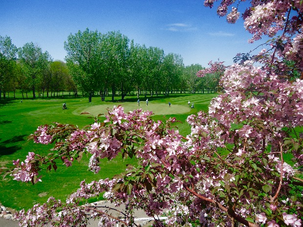 A picture of our 9th green in the background with a Japanese Cherry tree in bloom. Finally golf weather here in southern Alberta. The picture was taken by my wife who in her retired years spends time doing what she loves as the gardener at our course.
