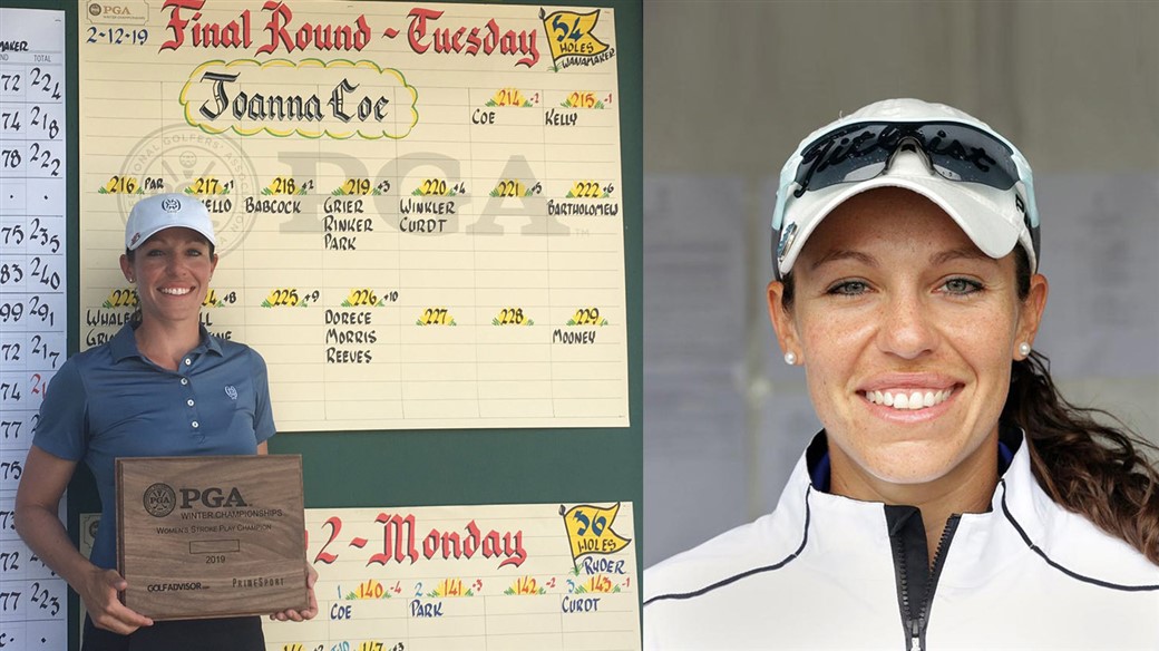 In a scintillating comeback, Joanna Coe, PGA (Baltimore Country Club) won the Women's PGA Stroke Play Championship in Port St. Lucie Florida. After day one Coe was 4-over-par and 10 places behind the Day One leader. However, during Round 2, Coe pushed her way up to the top of the leaderboard by carding eight birdies for a 64 (-8), which was the lowest single-round ever scored on The PGA Club's Ryder Course. The 64 was also a personal-best for the former Rollins University standout.